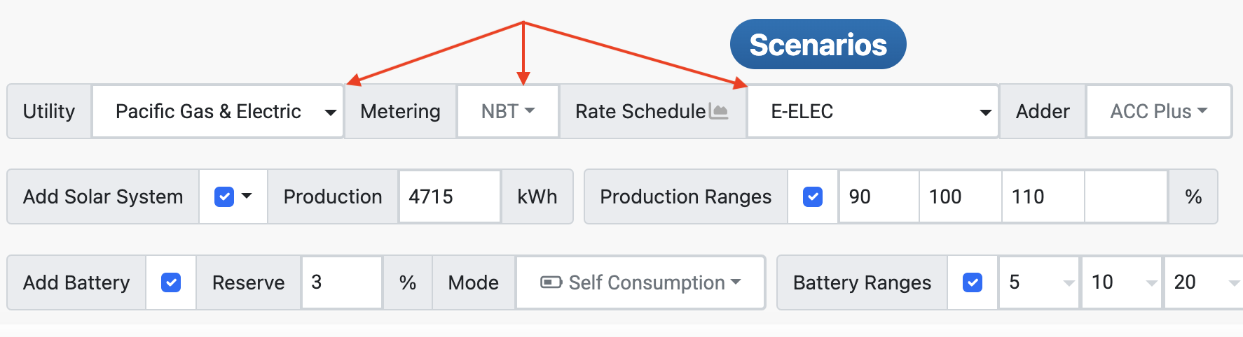 Now at the top of the Scenario Report, there is a new section below the user where you can specify the "before" (or current) Utility, Metering, Rate Schedule and Adder. Most of the time, these should be correctly selected for you based on the connected Utility. The Metering can be NEM (NEM2 for California) or NBT (NEM3 for California). If you are doing an add on for an existing NBT/NEM3 customer, this is where you specify that.